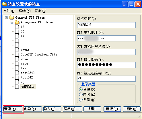 | 3,我站点设置中点“新建”,站点标签任意设置一个名字,FTP主机地址填自己的域名; 填入ftp站点用户名称和密码,ftp连接口用默认的21,登录类型选择为“普通”。